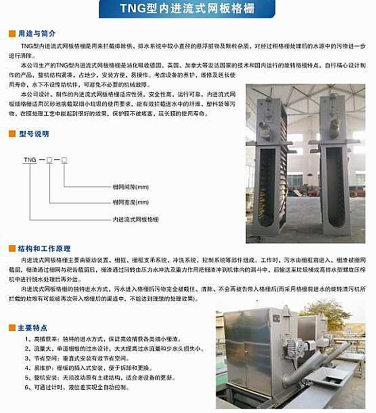 内进流网板格栅是一种目前新型的细格栅清污设备,采用连续拦截并清除流体中的固体杂物,可以达到较好的清污效果。如扁平的固体、杂草、瓜壳等,尤其是传统细格栅难以拦截的毛发纤维类污物,可大大降低后续处理工序的负荷。